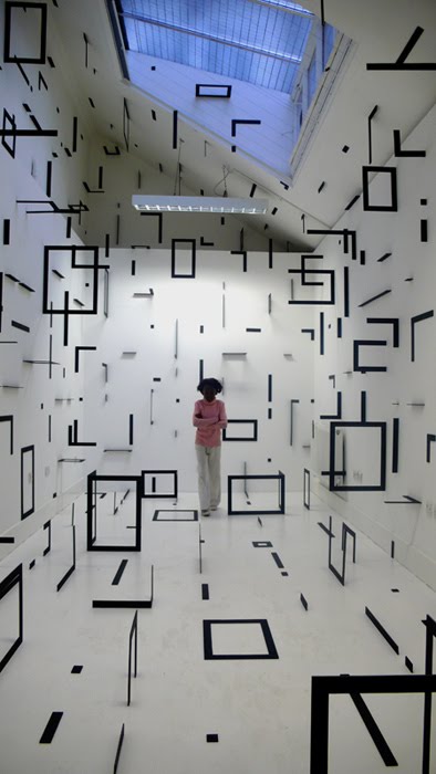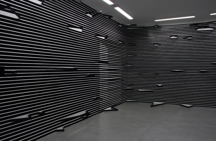 The paintings, murals and installations of Esther Stocker, based on grid structures and on the colors black, white and gray, consistently manifest entanglements, interconnections, interpenetrations, both semantically and formally, for which the variably deployed grid motif functions as a metaphorical logo. Stocker consistently breaks with one-dimensional notions of order, space, and painting as contextual and relational factors and concepts. When an artist so persistently preoccupied with spatial structures and spatial experience, simultaneously calls attention to the fact that „we know nothing about space“ (Stocker), then her stance would seem to testify to a productive skepticism which arises from unremitting and methodical attempts at understanding, and from insight into their-in principle-interminability.